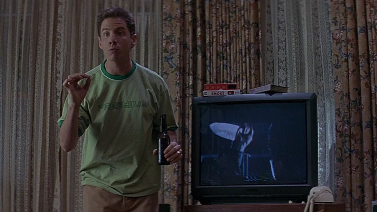 The Characters Are Horror Fans, Not Just Victims: Scream does something most slashers never attempted by putting horror literacy in the mouths of its characters. Randy does not just reference horror movies, he lives inside them. He lectures about Prom Night and Halloween while surrounded by aisles of VHS cases. He explains the “rules” like someone who has learned from other people’s deaths, even though he has only seen them on TV. Stu and Billy do the same thing, but in a darker way. They are horror fans reenacting horror stories instead of reacting to one.