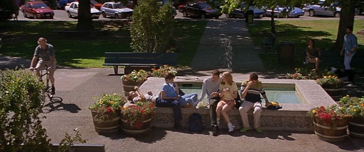 The Fountain Scene: Early in the film, Stu, Billy, Tatum, and Randy hang out by the school fountain after news of Casey and Steve’s deaths. Stu jokes, “I did not kill anyone,” and Billy immediately replies, “Nobody said you did.” That moment does several things at once. It links Stu to Casey, since she was his ex-girlfriend. It shows Billy reacting like someone managing suspicion rather than dismissing it. Stu also casually talks about gutting people as if it is nothing more than teen humor.